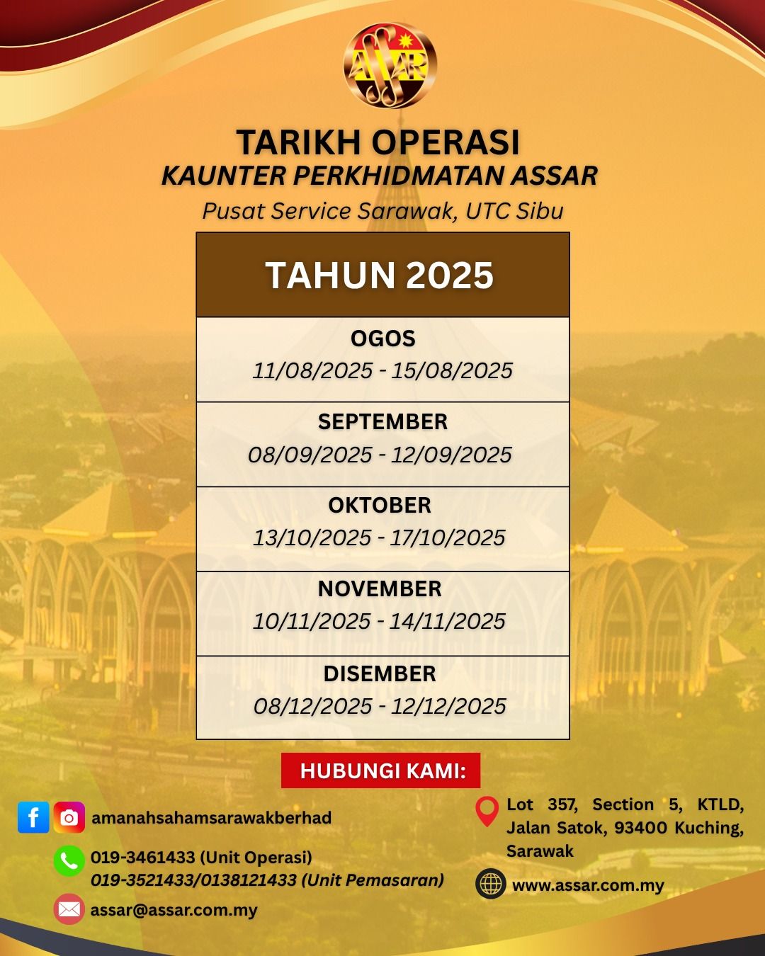 Kaunter Perkhidmatan ASSAR kini dibuka di Pusat Service Sarawak, UTC Sibu bagi memudahkan anda mendapatkan maklumat, membuat pertanyaan atau menguruskan pelaburan anda secara terus bersama kami.