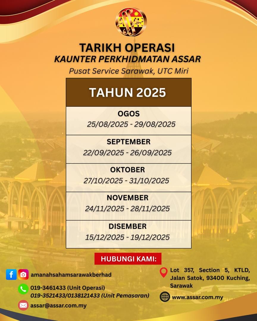 Kaunter Perkhidmatan ASSAR kini dibuka di Pusat Service Sarawak, UTC Miri bagi memudahkan anda mendapatkan maklumat, membuat pertanyaan atau menguruskan pelaburan anda secara terus bersama kami.
